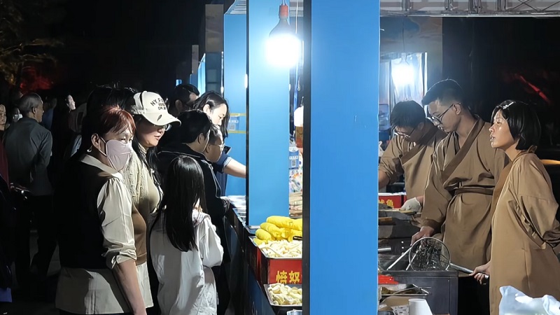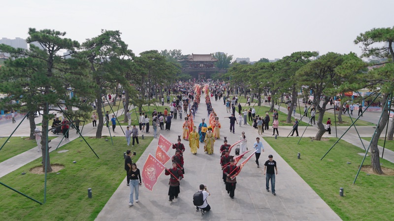 本次文化旅游節(jié)活動(dòng)自10月1日持續(xù)至10月5日,活動(dòng)期間設(shè)置了主題鮮明、層次豐富的特色內(nèi)容。每日10時(shí),來自中華泰山·封禪大典的演藝團(tuán)隊(duì)以《萬國(guó)來朝·盛世啟市》主題演出拉開序幕。天鼓初鳴之際,悠遠(yuǎn)號(hào)角與鏗鏘鼓點(diǎn)交織共鳴,依次呈現(xiàn)開場(chǎng)迎賓禮、司禮官肅穆登場(chǎng)、舞姬書生伴唐宮人物(李治、武則天)盛裝巡游。巡游結(jié)束后,演員們將化身隱藏NPC,身著唐宮華服扮演“帝王”“貴妃”等角色,與游客展開對(duì)詩猜謎、合影互動(dòng)等環(huán)節(jié)