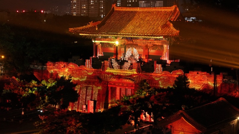 每日14時(shí)30分,活動(dòng)特邀來自肥城夢(mèng)幻桃花源的專業(yè)演職團(tuán)隊(duì)帶來專場(chǎng)文藝演出。當(dāng)夜幕降臨,18時(shí)30至21時(shí)(每半小時(shí)一場(chǎng)),岱廟北城墻將變身“巨型光影幕布”,上演燈光秀表演。光影流轉(zhuǎn)間,千年歷史與現(xiàn)代科技碰撞融合,讓游客在光影變幻中直觀感受泰山文化的厚重底蘊(yùn)與魅力。